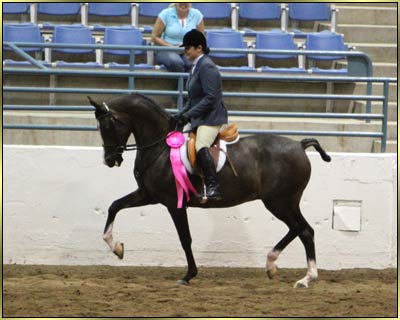 By a National Top 10 English Junior Horse and out of the dam of Hucklebey Bleus+/ (2003 US National Champion Country Pleasure AAOTR 18-39). He looks like he will be following in his brother's foot steps. Loves to work and is a Country Pleasure prospect. Sweepstakes. Sold